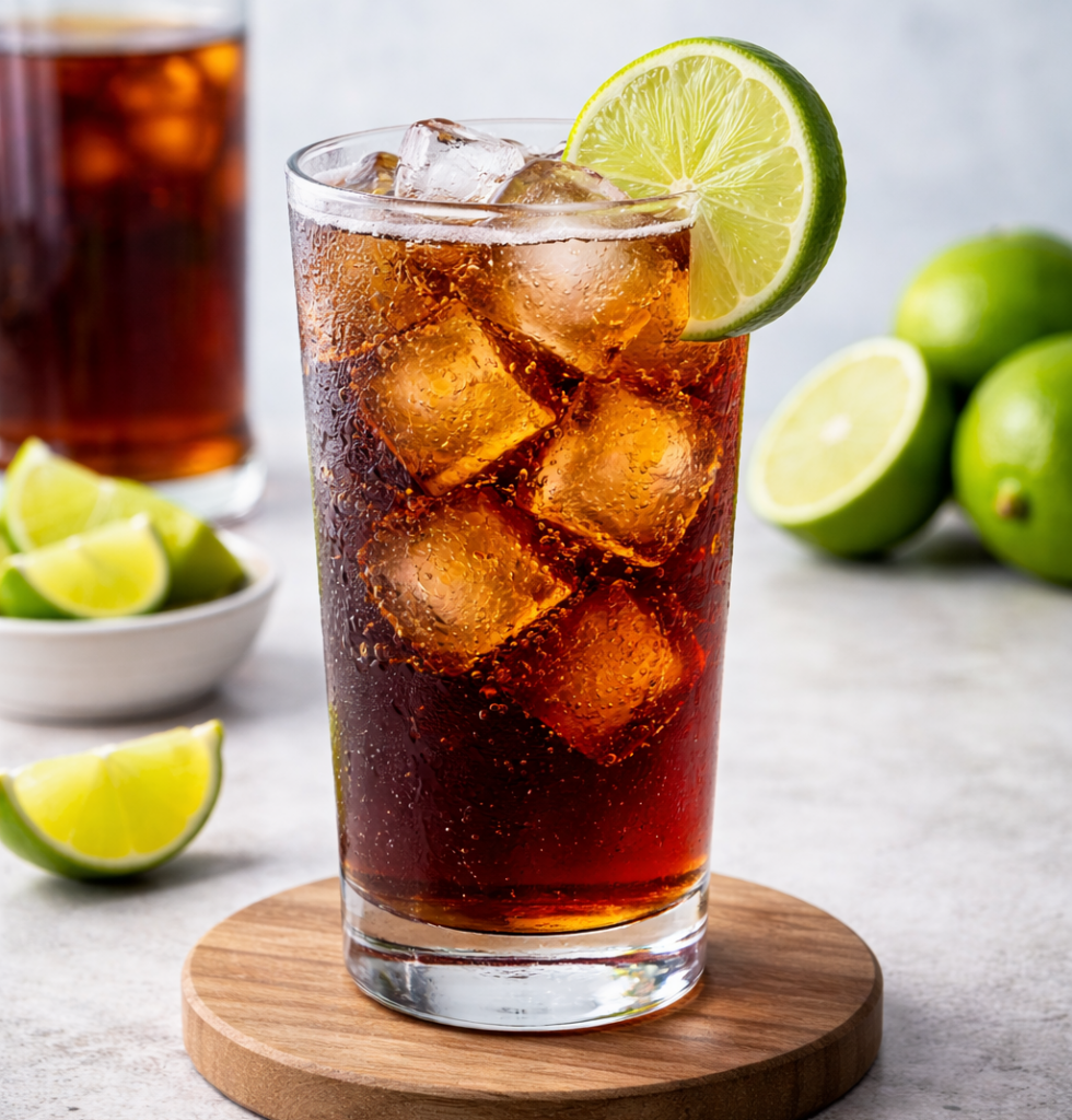 Serviert in einem Longdrinkglas mit Eis, garniert mit einer Limettenspalte – ein klassischer, unkomplizierter Rum-Longdrink.